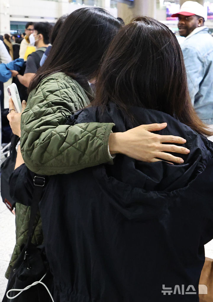[인천공항=뉴시스] 최진석 기자 = 이란 사태 여파로 중단됐던 아랍에미리트(UAE) 두바이공항에서 인천국제공항으로 오는 직항편 운항이 재개된 6일 인천국제공항 제1여객터미널을 통해 귀국한 두바이 출발 EK322편 탑승객이 마중나온 가족과 포옹하고 있다. 2026.03.06. [email protected]