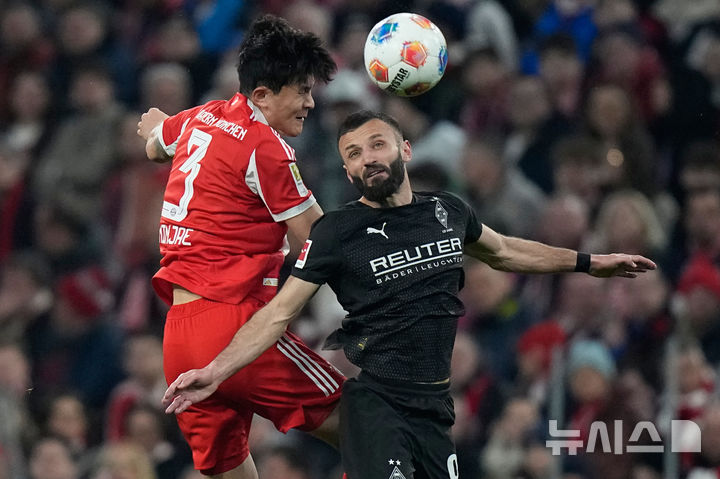 [뮌헨=AP/뉴시스] 바이에른 뮌헨의 김민재(왼쪽)가 6일(현지 시간) 독일 뮌헨 알리안츠 아레나에서 열린 2025-26 분데스리가 25라운드 묀헨글라트바흐와 경기 중 공중 볼을 다투고 있다. 김민재는 풀타임을 소화했고, 뮌헨은 4-1로 승리하며 리그 선두 질주를 이어갔다. 2026.03.07.