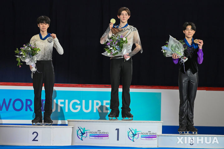 [탈린=신화/뉴시스] 서민규(왼쪽)가 6일(현지 시간) 에스토니아 탈린의 톤디라바 아이스홀에서 열린 2026 국제빙상경기연맹(ISU) 피겨스케이팅 주니어 세계선수권대회 남자 싱글 시상식에서 은메달을 목에 걸고 포즈를 취하고 있다. 서민규는 프리 스케이팅에서 기술점수(TES) 81.39점, 예술점수(PCS) 77.19점(감점 1점), 합계 157.58점으로 쇼트와 총합계 243.91점을 받아 준우승을 차지했다. 2026.03.07.