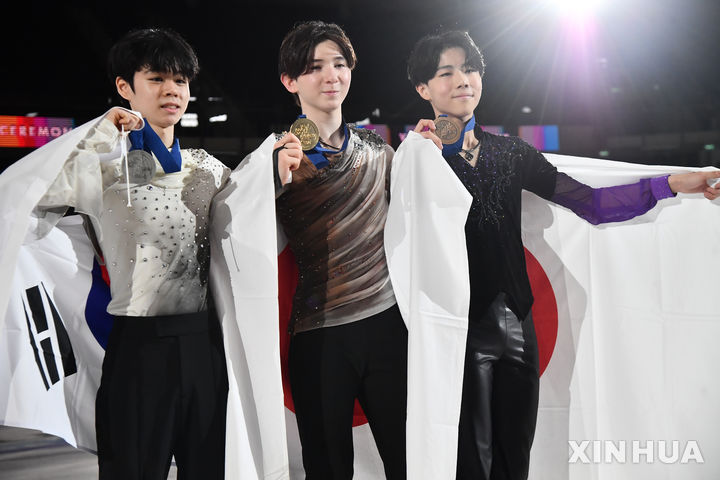 [탈린=신화/뉴시스] 서민규(왼쪽)가 6일(현지 시간) 에스토니아 탈린의 톤디라바 아이스홀에서 열린 2026 국제빙상경기연맹(ISU) 피겨스케이팅 주니어 세계선수권대회에서 준우승, 은메달을 목에 걸고 포즈를 취하고 있다. 서민규는 프리 스케이팅에서 기술점수(TES) 81.39점, 예술점수(PCS) 77.19점(감점 1점), 합계 157.58점으로 쇼트와 총합계 243.91점을 받아 준우승을 차지했다. 2026.03.07.