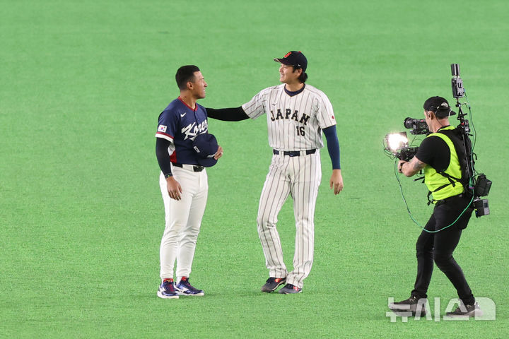 [도쿄=뉴시스] 권창회 기자 = 7일 일본 도쿄돔에서 열린 2026 WBC 조별리그 C조 2차전 한국과 일본의 경기 시작전 한국 저마이 존스와 일본 쇼헤이 오타니가 대화하고 있다. 2026.03.07. [email protected]