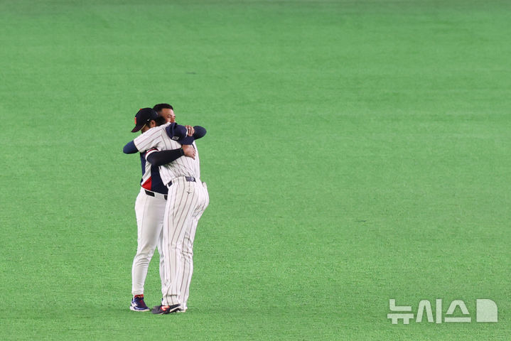 [도쿄=뉴시스] 권창회 기자 = 7일 일본 도쿄돔에서 열린 2026 WBC 조별리그 C조 2차전 한국과 일본의 경기 시작전 한국 저마이 존스와 일본 쇼헤이 오타니가 포옹하고 있다. 2026.03.07. [email protected]