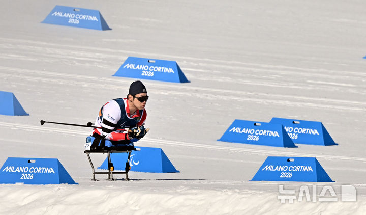 [테세로=뉴시스] 사진공동취재단 = 바이애슬론 원유민이 7일(현지시간) 이탈리아 테세로 크로스컨트리 스키 스타디움에서 열린 2026 밀라노 코르티나 동계패럴림픽 바이애슬론 스프린트 7.5km 경기에서 역주하고 있다. 2026.03.07. [email protected]