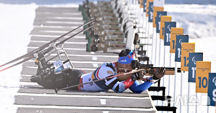 [테세로=뉴시스] 사진공동취재단 = 바이애슬론 신의현이 7일(현지시간) 이탈리아 테세로 크로스컨트리 스키 스타디움에서 열린 2026 밀라노 코르티나 동계패럴림픽 바이애슬론 스프린트 7.5km 경기에서 사격을 하고 있다. 2026.03.07. [email protected]