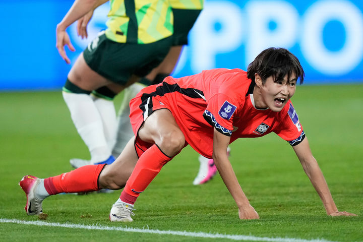 [시드니=AP/뉴시스] 문은주가 8일(현지 시간) 호주 시드니 스타디움 오스트레일리아에서 열린 2026 아시아축구연맹(AFC) 여자 아시안컵 축구 조별 리그 A조 3차전 호주와 경기 전반 13분 선제골을 넣고 환호하고 있다. 한국은 3-2로 앞서가던 후반 추가 시간 실점해 3-3으로 비기며 A조 1위로 8강에 올랐다. 2026.03.08.