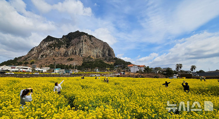 [서귀포=뉴시스] 우장호 기자 = 꽃샘추위가 찾아온 8일 오전 제주 서귀포시 안덕면 산방산 인근에 봄의 전령 유채꽃이 활짝 펴 상춘객들의 시선을 사로 잡고 있다. 2026.03.08. [email protected]