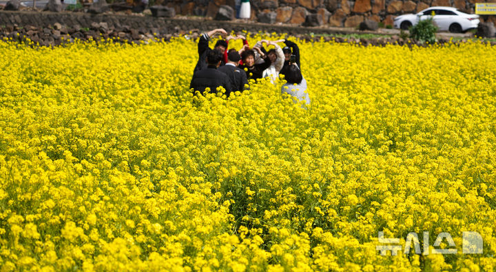 [서귀포=뉴시스] 우장호 기자 = 꽃샘추위가 찾아온 8일 오전 제주 서귀포시 안덕면 산방산 인근에 봄의 전령 유채꽃이 활짝 펴 상춘객들의 시선을 사로 잡고 있다. 2026.03.08. [email protected]