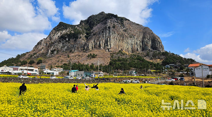 [서귀포=뉴시스] 우장호 기자 = 꽃샘추위가 찾아온 8일 오전 제주 서귀포시 안덕면 산방산 인근에 봄의 전령 유채꽃이 활짝 펴 상춘객들의 시선을 사로 잡고 있다. 2026.03.08. [email protected]