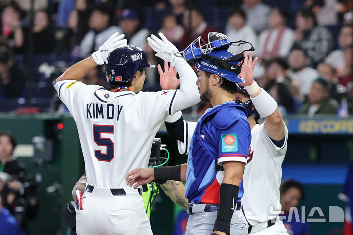 [도쿄=뉴시스] 권창회 기자 = 8일 일본 도쿄돔에서 열린 2026 WBC 조별리그 C조 3차전 한국과 대만의 경기, 6회말 1사 1루 한국 김도영이 2점 홈런을 친 뒤 박동원과 하이파이브 하고 있다. 2026.03.08. [email protected]