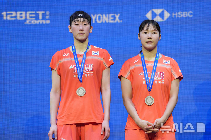 [버밍엄=AP/뉴시스] 백하나와 이소희가 8일(현지 시간) 영국 버밍엄 유틸리타 아레나에서 열린 2026 세계배드민턴연맹(BWF) 월드 투어(슈퍼 1000) 전영오픈 여자 복식 결승에서 준우승을 차지한 뒤 시상식에서 메달을 목에 걸고 있다. 백하나-이소희는 류성수-탄닝(중국)조에 0-2(18-21 12-21)로 패배해 준우승을 차지했다. 2026.03.09.