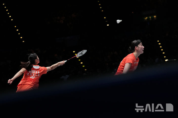 [버밍엄=AP/뉴시스] 백하나와 이소희가 8일(현지 시간) 영국 버밍엄 유틸리타 아레나에서 열린 2026 세계배드민턴연맹(BWF) 월드 투어(슈퍼 1000) 전영오픈 여자 복식 결승에서 류성수-탄닝(중국)과 경기를 치르고 있다. 백하나-이소희는 0-2(18-21 12-21)로 패배해 준우승을 차지했다. 2026.03.09.