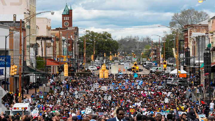 [셀마=AP/뉴시스] 8일(현지 시간) 미 앨라배마주 셀마에서 열린 제61주년 '피의 일요일'(블러디 선데이) 행진 참가자들이 행진하고 있다. 1965년 3월 7일, 참정권을 요구하는 흑인들의 시위가 열려 경찰이 이들을 강경 진압하면서 유혈 사태가 벌어져 '피의 일요일'이라고 부르며 이후 9일과 21일 총 세 차례의 행진이 이어지면서 린든 존슨 당시 대통령은 아프리카계 미국인들의 투표권 보장을 골자로 하는 투표법에 서명했다. 2026.03.09.