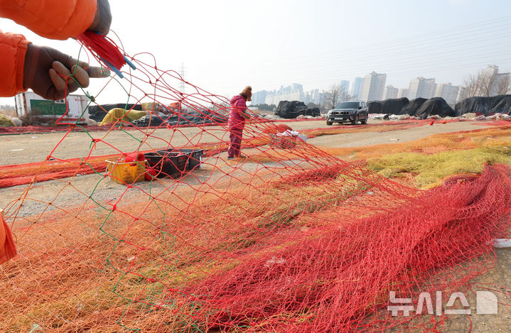[인천=뉴시스] 전진환 기자 = 9일 오전 인천 남동구 소래포구 인근에서 어민들이 봄 조업을 앞두고 겨우내 사용하지 않았던 그물을 손질하며 출어준비를하고 있다. 2026.03.09. [email protected]