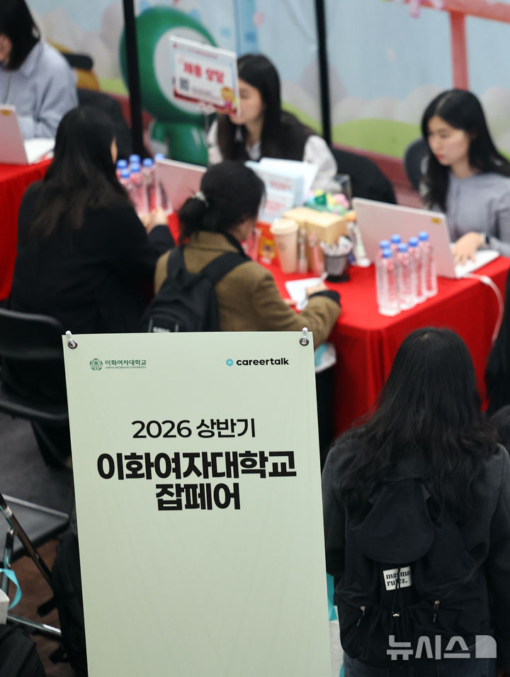 [서울=뉴시스] 최진석 기자 = 9일 서울 서대문구 이화여자대학교에서 열린 2026 상반기 이화여자대학교 잡페어를 찾은 학생들이 취업상담을 받고 있다. 2026.03.09. [email protected]