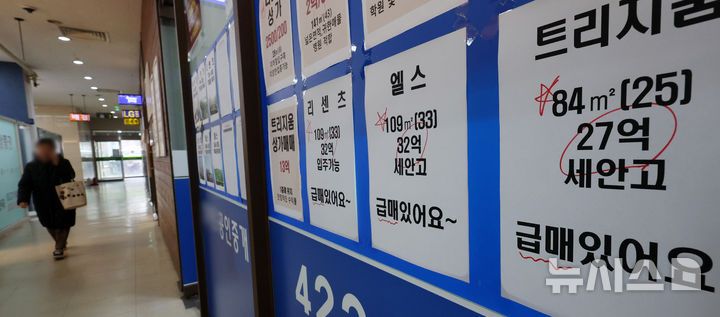 [서울=뉴시스] 배훈식 기자 = 서울 집값의 바로미터로 불리는 강남3구(강남·서초·송파)와 용산구 집값이 2주 연속 하락한 9일 오후 서울 송파구의 한 공인중개사 사무소에 아파트 급매물 안내 표지가 붙어있다. 2026.03.09. [email protected]