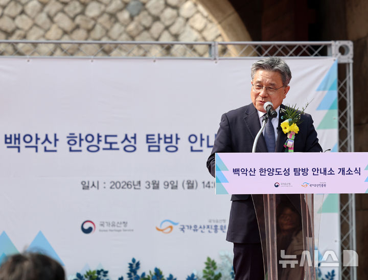 [서울=뉴시스] 이영환 기자 = 허민 국가유산청장이 9일 오후 서울 종로구 창의문에서 열린 백악산 한양도성 안내소 개소식에 참석해 인사말을 하고 있다. 2026.03.09. [email protected]