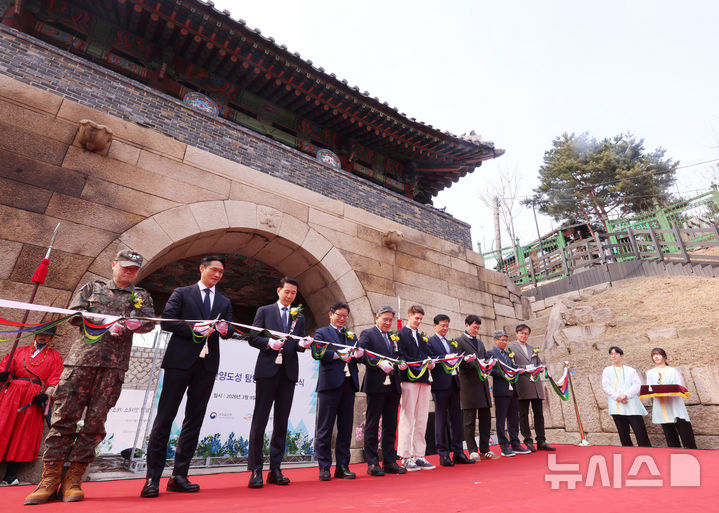 [서울=뉴시스] 이영환 기자 = 허민(왼쪽 다섯 번째부터) 국가유산청장, 방송인 파비앙 등 내빈들이 9일 오후 서울 종로구 창의문에서 열린 백악산 한양도성 안내소 개소식에서 테이프 커팅을 하고 있다. 2026.03.09. [email protected]
