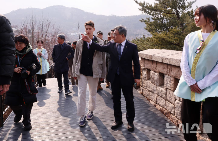 [서울=뉴시스] 이영환 기자 = 허민 국가유산청장과 방송인 파비앙 등 내빈들이 9일 오후 서울 종로구 창의문에서 열린 백악산 한양도성 안내소 개소식을 마친 후 성곽길을 따라 걸어가고 있다. 2026.03.09. [email protected]