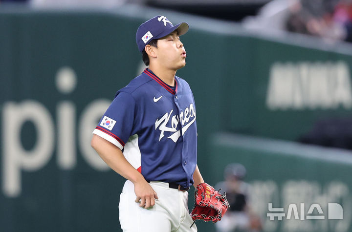 [도쿄=뉴시스] 권창회 기자 = 9일 일본 도쿄돔에서 열린 2026 WBC 조별리그 C조 4차전 한국과 호주의 경기, 5회말 한국 소형준이 호주 선두타자 그렌디닝에게 홈런을 허용한 뒤 아쉬워하고 있다. 2026.03.09. [email protected]