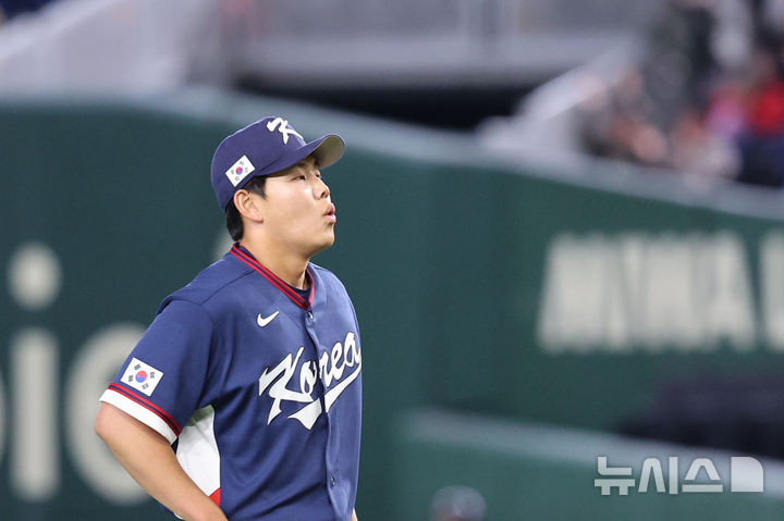 [도쿄=뉴시스] 권창회 기자 = 9일 일본 도쿄돔에서 열린 2026 WBC 조별리그 C조 4차전 한국과 호주의 경기, 5회말 한국 소형준이 호주 선두타자 그렌디닝에게 홈런을 허용한 뒤 아쉬워하고 있다. 2026.03.09. [email protected]