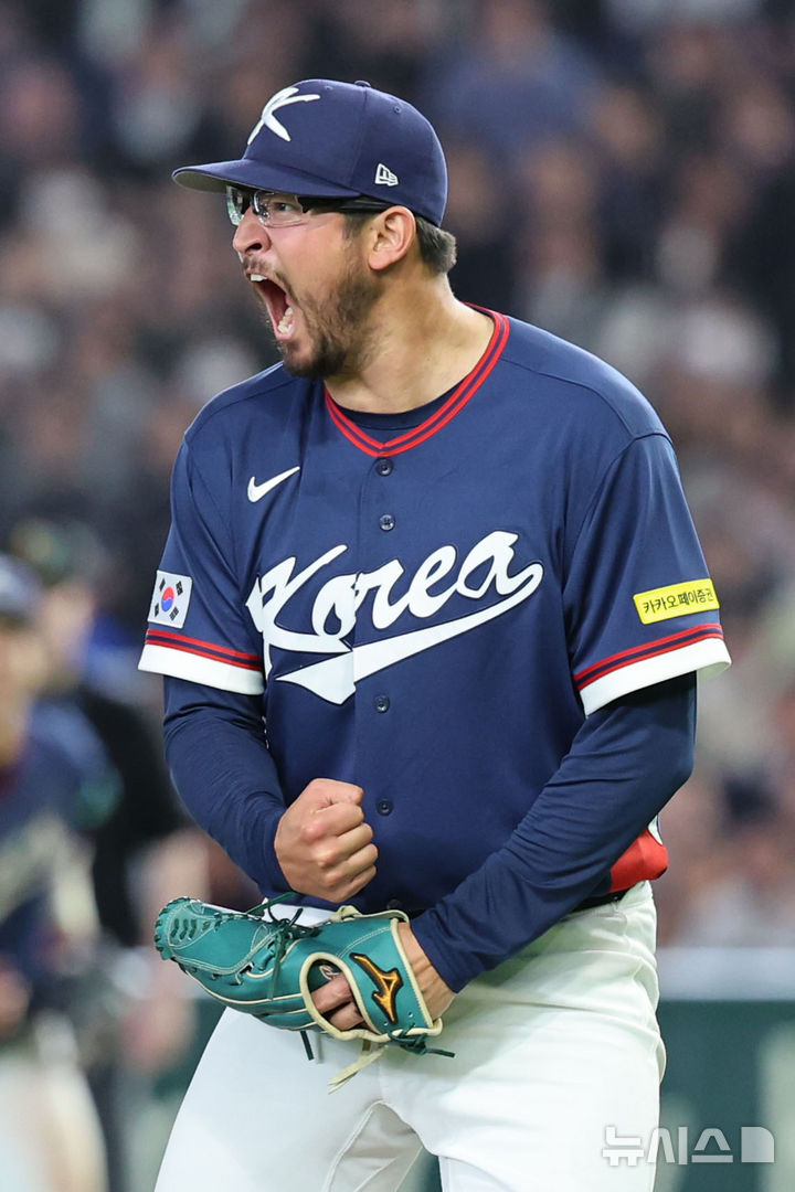 [도쿄=뉴시스] 권창회 기자 = 9일 일본 도쿄돔에서 열린 2026 WBC 조별리그 C조 4차전 한국과 호주의 경기, 7회말 2사 3루 한국 데인 더닝이 호주 윙그로브를 삼진으로 잡은 뒤 포효하고 있다. 2026.03.09. [email protected]
