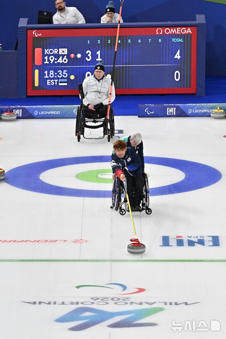 [코르티나담페초=뉴시스] 사진공동취재단 = 휠체어컬링 이용석이 9일(현지시간) 이탈리아 코르티나담페초 컬링 올림픽 스타디움에서 열린 2026 밀라노 코르티나 패럴림픽 휠체어컬링 믹스더블 에스토니아와의 경기에서 스톤을 밀고 있다. 2026.03.10. [email protected]