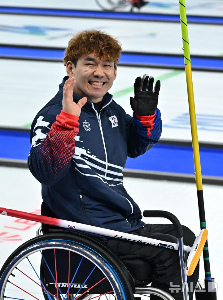 [코르티나담페초=뉴시스] 사진공동취재단 = 휠체어컬링 이용석이 9일(현지시간) 이탈리아 코르티나담페초 컬링 올림픽 스타디움에서 열린 2026 밀라노 코르티나 패럴림픽 휠체어컬링 믹스더블 에스토니아와의 경기에서 승리 후 응원단을 향해 인사를 하고 있다. 2026.03.10. [email protected]