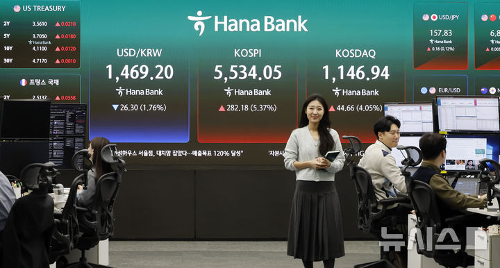 [서울=뉴시스] 김혜진 기자 = 코스피가 전 거래일(5251.87)보다 271.34포인트(5.17%) 오른 5523.21에 개장한 10일 오전 서울 중구 하나은행 딜링룸 전광판에 지수가 표시 되고 있다.