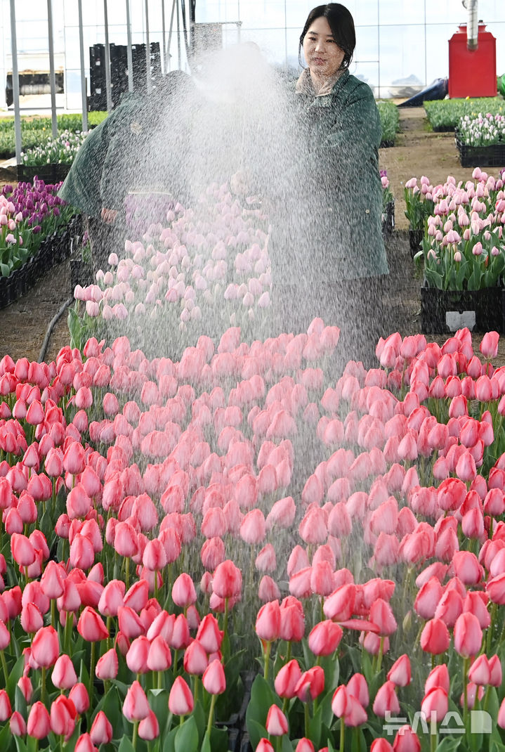 [용인=뉴시스] 김종택 기자 = 10일 경기 용인시 에버랜드 식물하우스에서 직원들이 피어나기 시작한 튤립에 물을 주고 있다.