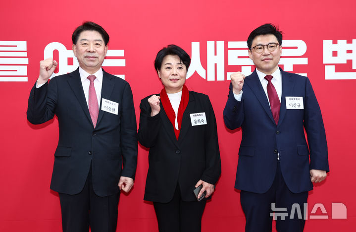 [서울=뉴시스] 김명년 기자 = 국민의힘 서울시장 예비후보들이 10일 오전 서울 여의도 국민의힘 중앙당사에서 열린 지방선거 광역단체장 및 중앙당 관할 기초단체자 후보자 면접에서 기념촬영하고 있다. 왼쪽부터 이승현 한국무역협회 부회장, 윤희숙 전 의원, 이상규 서울 성북을 당협위원장. 2026.03.10. [email protected]