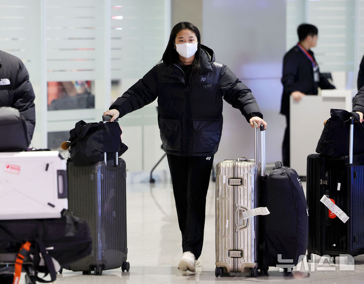 [인천공항=뉴시스] 홍효식 기자 = 세계배드민턴연맹(BWF) 월드투어 슈퍼1000 전영오픈 여자 단식 결승에서 2연패에 도전했던 안세영이 중국 왕즈이에 패하며 준우승을 차지한 가운데 10일 인천국제공항 제2터미널로 귀국하고 있다. 2026.03.10. [email protected]