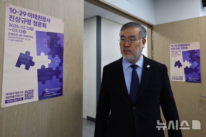 [서울=뉴시스] 최진석 기자 = 송기춘 10·29 이태원참사 진상규명과 재발 방지를 위한 특별조사위원회(특조위) 위원장이 10일 서울 중구 이태원참사 특조위에서 열린 청문회 관련 기자회견에 입장하고 있다. 2026.03.10. [email protected]