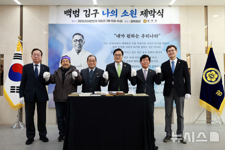 [서울=뉴시스] 고승민 기자 = 우원식(왼쪽 네번째) 국회의장과 이종찬(왼쪽 세번째) 광복회장 등 참석자들이 10일 서울 여의도 광복회관에서 열린 '백범 김구 나의 소원 제막식'에서 기념촬영을 하고 있다. 2026.03.10. [email protected]