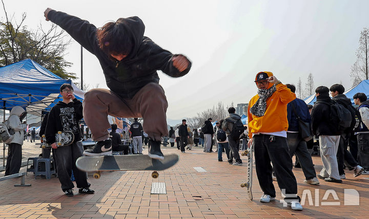 [경산=뉴시스] 이무열 기자 = 11일 경북 경산시 영남대학교에서 열린 동아리 박람회에서 스케이트보드 동아리 학생들이 스케이트보드 기술을 선보이고 있다. 2026.03.11. [email protected]