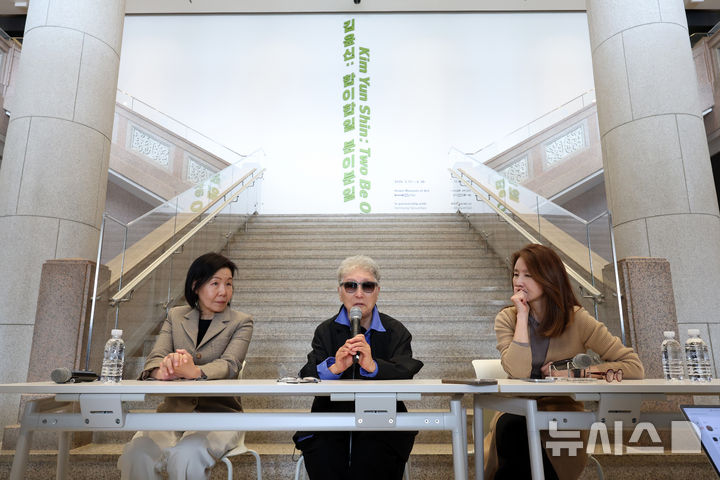 [용인=뉴시스] 박진희 기자 = 호암미술관 김성원(왼쪽부터) 부관장, 김윤신 조각가, 태현선 수석큐레이터가 11일 경기 용인시 호암미술관에서 70여 년에 걸친 삶과 예술세계를 선보이는 첫 대규모 회고전 '김윤신: 합이합일 분이분일' 기자간담회를 하고 있다. 이번 전시는 '합이합일 분이분일(合二合一 分二分一)'로 대표되는 나무 조각들은 물론 한국 여성 조각 1세대를 대표하는 김윤신 예술 세계의 본질과 전개 과정을 살펴볼 수 있는 판화와 회화까지 다양하게 조명한다. 2026.03.11. [email protected]