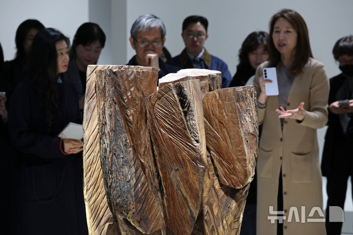 [용인=뉴시스] 박진희 기자 = 태현선(오른쪽) 호암미술관 수석 큐레이터가 11일 경기 용인시 호암미술관에서 70여 년에 걸친 삶과 예술세계를 선보이는 첫 대규모 회고전 '김윤신: 합이합일 분이분일' 기자간담회를 진행하고 있다. 이번 전시는 '합이합일 분이분일(合二合一 分二分一)'로 대표되는 나무 조각들은 물론 한국 여성 조각 1세대를 대표하는 김윤신 예술 세계의 본질과 전개 과정을 살펴볼 수 있는 판화와 회화까지 다양하게 조명한다. 2026.03.11. [email protected]