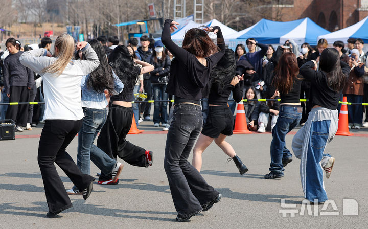 [경산=뉴시스] 이무열 기자 = 11일 경북 경산시 영남대학교에서 열린 동아리 버스킹에서 댄스동아리 학생들이 스트릿 댄스 공연을 선보이고 있다. 2026.03.11. [email protected]