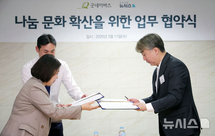 [서울=뉴시스] 홍효식 기자 = 염영남(오른쪽) 뉴시스 대표이사 사장과 전미선 굿네이버스 사무총장이 11일 오후 서울 중구 뉴시스 본사에서 열린 뉴시스-굿네이버스 '나눔 문화 확산을 위한 업무 협약식'에서 서명한 협약서를 교환하고 있다. 2026.03.11. [email protected]