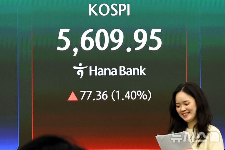 [서울=뉴시스] 최진석 기자 = 코스피가 전 거래일(5532.59)보다 77.36포인트(1.40%) 상승한 5609.95에 마감한 11일 서울 중구 하나은행 딜링룸에 코스피 종가가 보이고 있다.