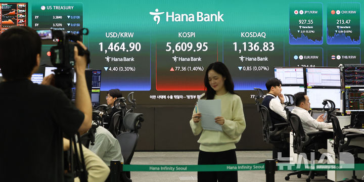 [서울=뉴시스] 최진석 기자 = 코스피가 전 거래일(5532.59)보다 77.36포인트(1.40%) 상승한 5609.95에 마감한 11일 서울 중구 하나은행 딜링룸에 코스피 종가가 보이고 있다.