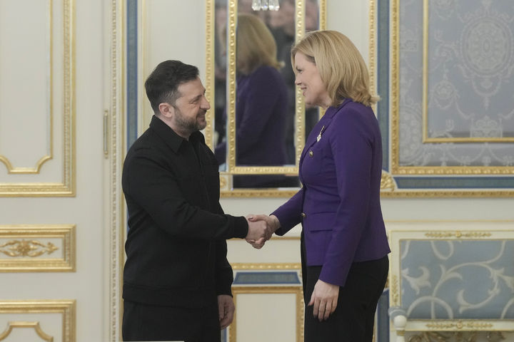 [키이우=AP/뉴시스] 볼로디미르 젤렌스키(왼쪽) 우크라이나 대통령이 11일(현지 시간) 우크라이나 키이우를 방문한 율리아 클뢰크너 독일 연방의회 의장과 악수하고 있다. 2026.03.12.