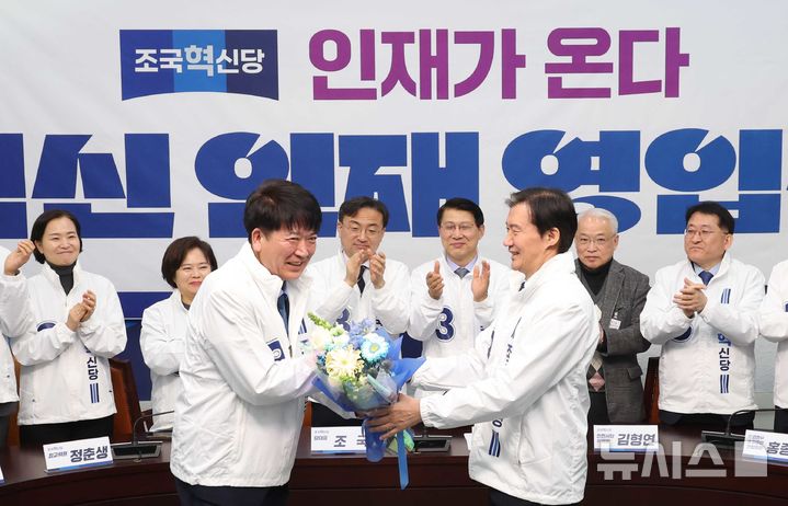 [서울=뉴시스] 조성봉 기자 = 조국 조국혁신당 대표가 12일 오전 서울 여의도 국회에서 열린 혁신인재영입식에서 안광호 전 인천경제자유구역청 영종청라사업본부장에게 꽃다발을 전달하고 있다. 2026.03.12. [email protected]