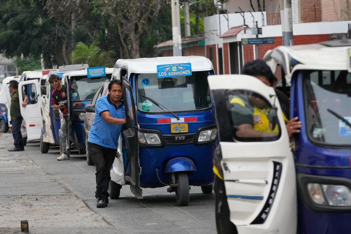 [리마=AP/뉴시스] 11일(현지 시간) 페루 리마에서 주요 가스 파이프라인 파열로 연료 공급에 차질이 빚어져 당국이 배급을 실시하는 가운데 주유소에서 주유하려는 모토택시 운전자들이 줄지어 기다리는 차량 행렬 속에서 자신의 차를 밀고 있다. 2026.03.12.