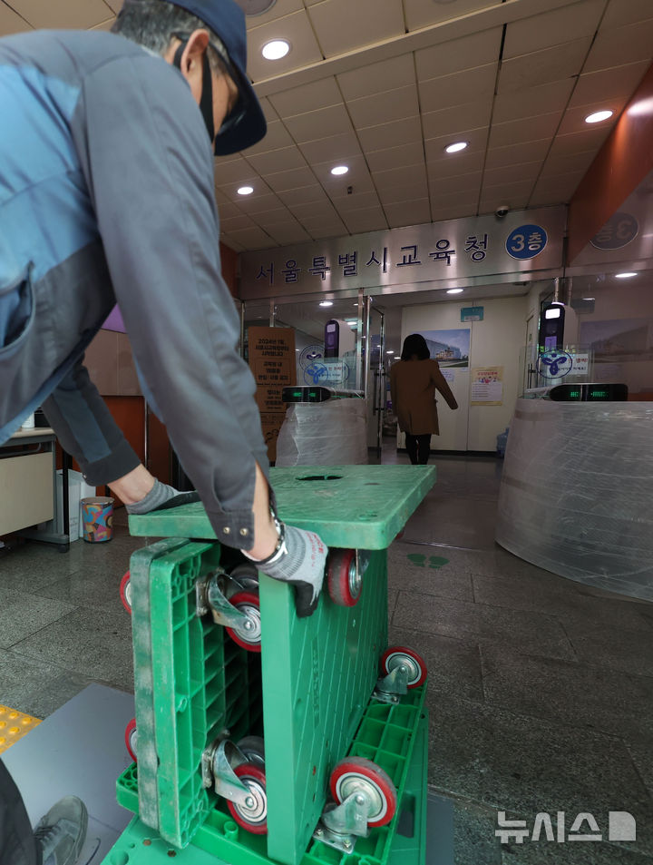 [서울=뉴시스] 홍효식 기자 = 서울시교육청이 용산구 후암동 신청사로 부서별 순차 이전을 내일(13일)부터 진행하는 가운데 12일 서울 종로구 서울시교육청에서 관계자들이 이삿짐을 옮기고 있다. 2026.03.12. [email protected]