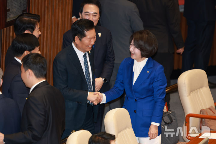 [서울=뉴시스] 고승민 기자 = 더불어민주당 정청래 대표와 추미애 의원이 12일 서울 여의도 국회에서 열린 제433회 국회(임시회) 제1차 본회의에서 인사를 나누고 있다. 2026.03.12. [email protected]