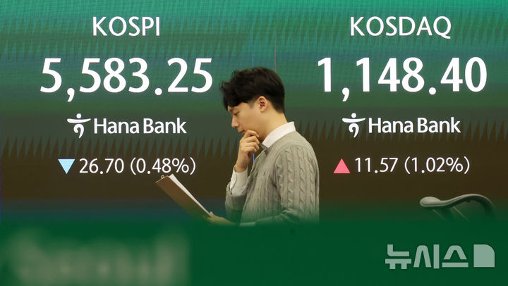 [서울=뉴시스] 홍효식 기자 = 코스피가 전 거래일(5609.95)보다 26.70포인트(0.48%) 하락한 5583.25에 마감한 12일 오후 서울 중구 하나은행 딜링룸 전광판에 지수가 표시되고 있다.