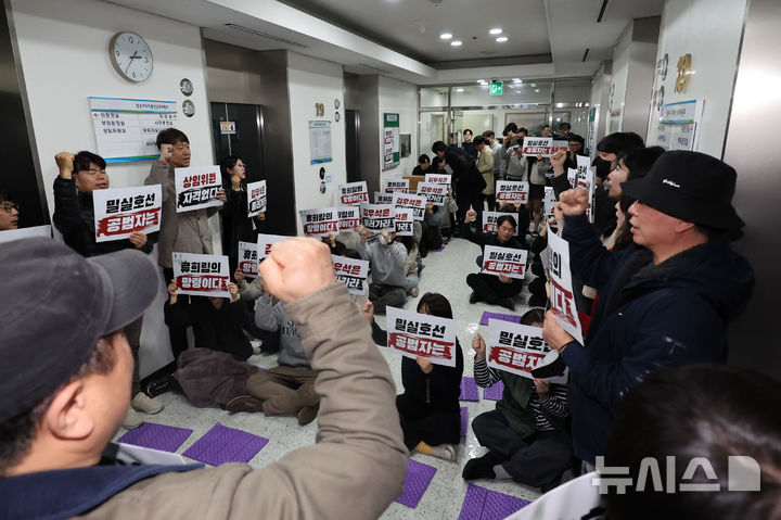[서울=뉴시스] 권창회 기자 = 언론노조 조합원들이 12일 오후 서울 양천구 방송미디어통신심의위원회에서 열리는 2026년 제1차 방미심위 정기 회의 시작을 앞두고 김우석 위원 사퇴를 촉구하며 구호를 외치고 있다. 2026.03.12. [email protected]