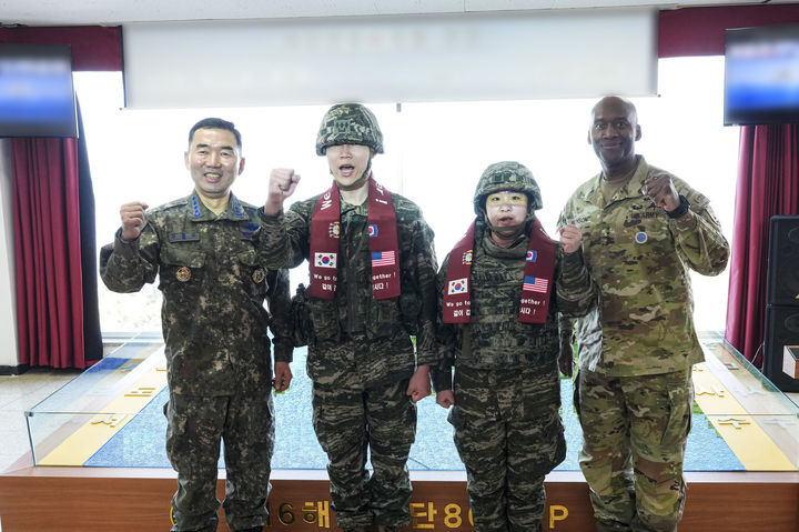 [서울=뉴시스] 김진아 기자 = 진영승 합동참모본부 의장과 제이비어 브런슨 한미연합군사령관이 12일 해병 6여단에서 장병들과 기념 촬영하고 있다. (사진=합동참모본부 제공) 2026.03.12. [email protected] *재판매 및 DB 금지