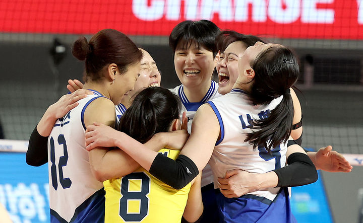 [서울=뉴시스] 김진아 기자 = 12일 대전 충무체육관에서 열린 진에어 2025-26 V리그 여자부 현대건설과 정관장의 경기, 현대건설 선수들이 3-1로 승리 후 기뻐하고 있다. (사진=현대건설 배구단 제공) 2026.03.12. [email protected] *재판매 및 DB 금지