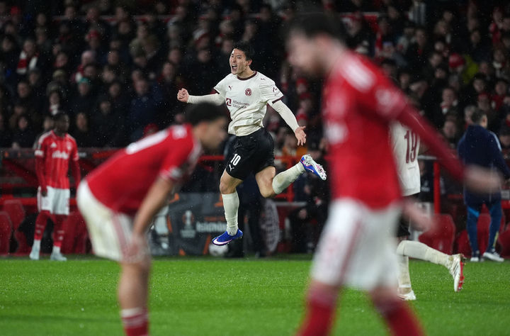 [노팅엄=AP/뉴시스] 미트윌란(덴마크)의 조규성이 12일(현지 시간) 영국 노팅엄의 더 시티 그라운드에서 열린 2025-26 유럽축구연맹(UEFA) 유로파리그(UEL) 16강 1차전 노팅엄 포레스트와 경기 후반 35분 선제 결승 골을 넣고 환호하고 있다. 미트윌란이 1-0으로 승리하며 2차전을 남겨뒀다. 2026.03.13.